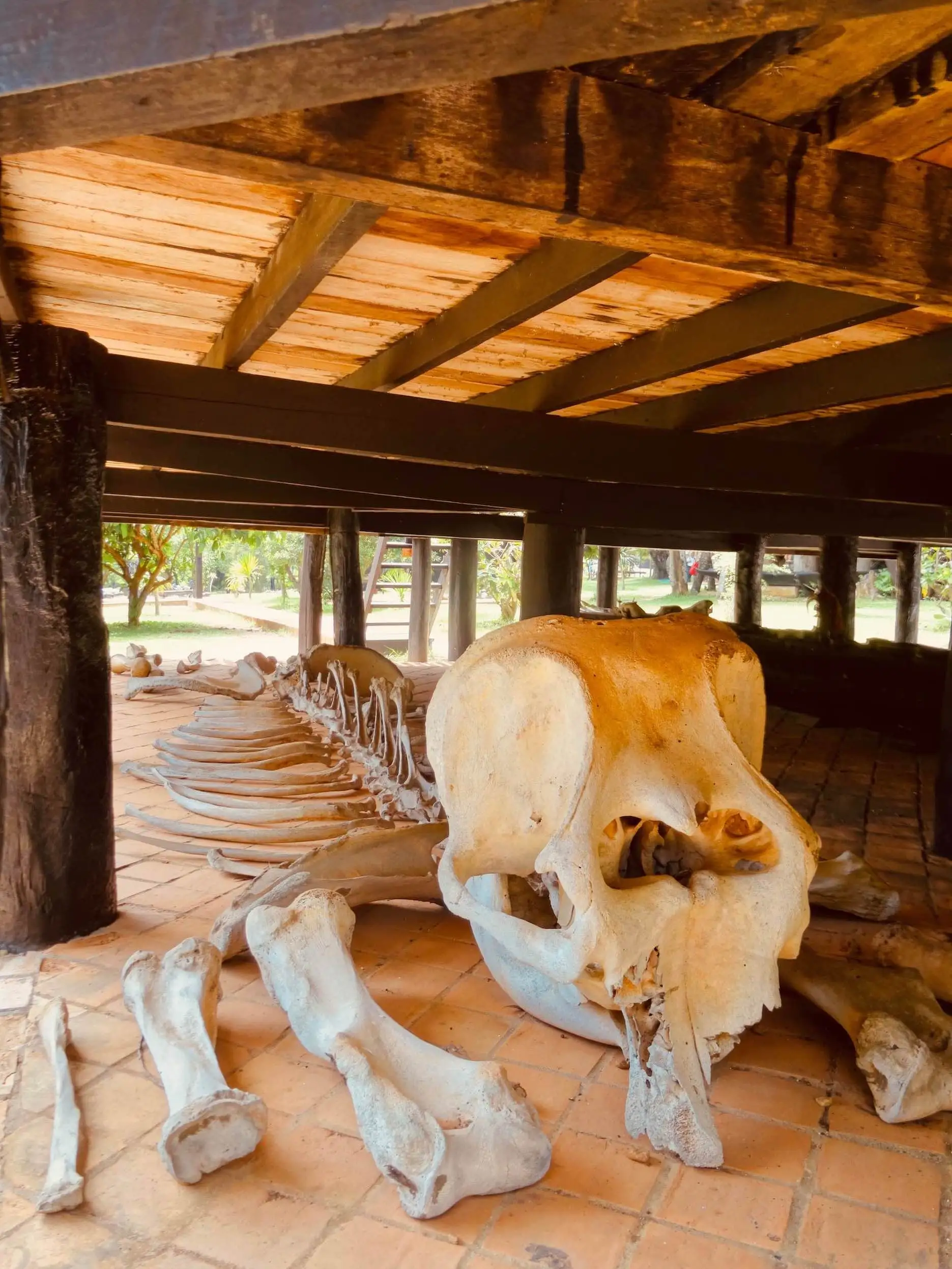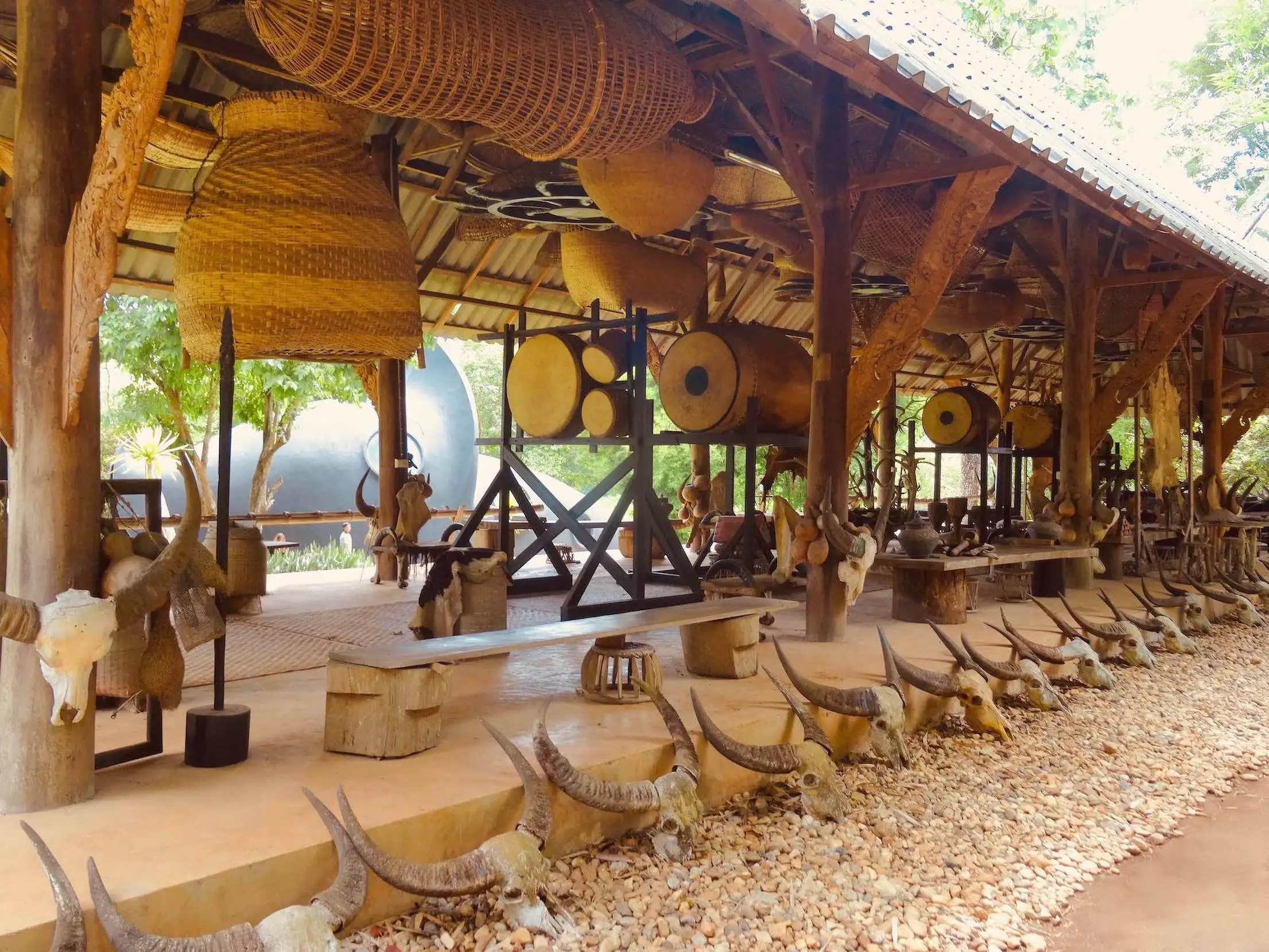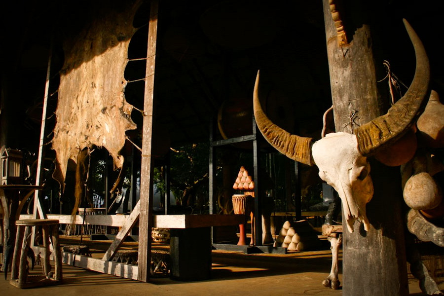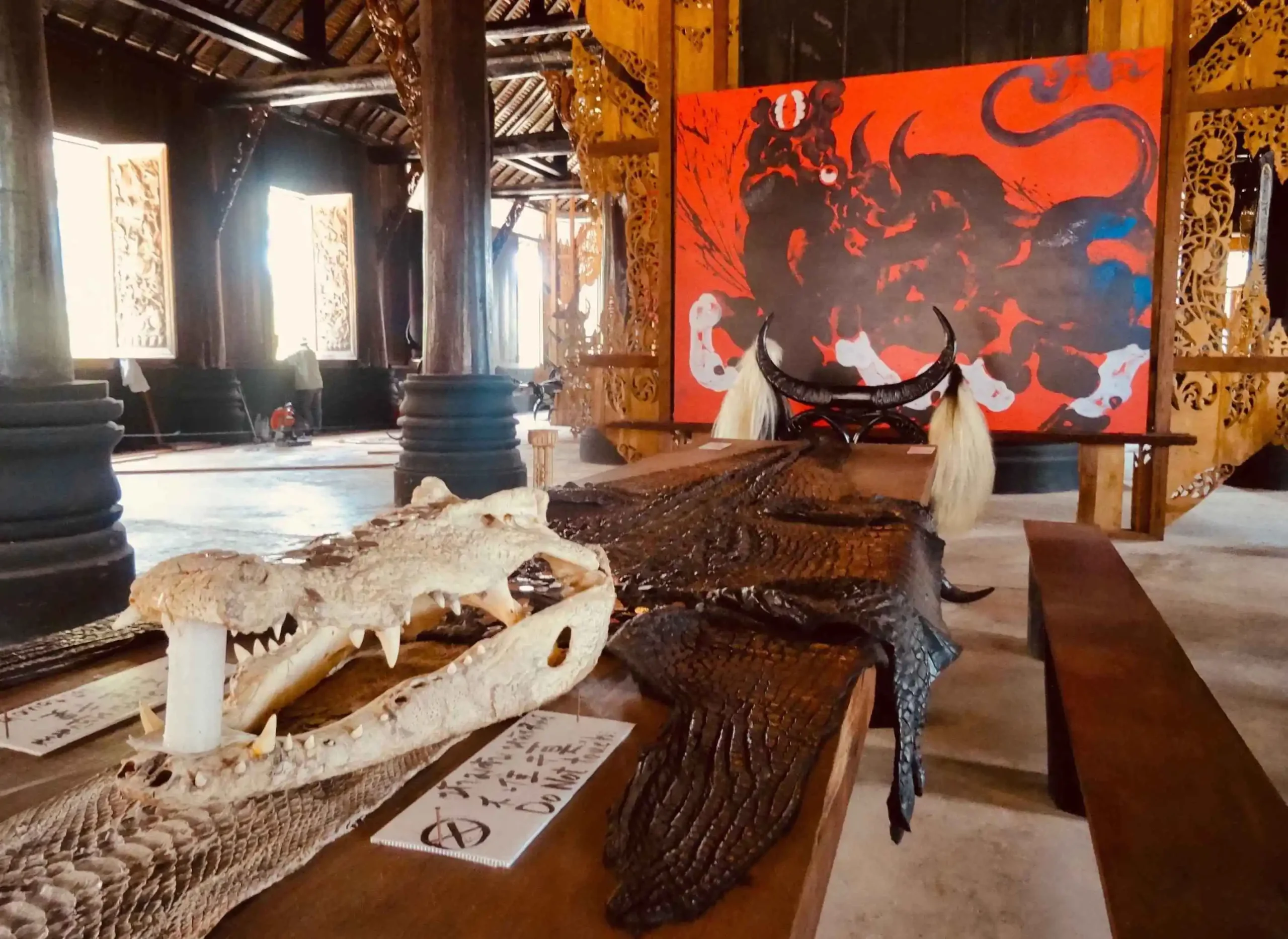 The museum complex features over 40 black wooden structures scattered across a peaceful garden setting. Inside the Main Hall (Sanctuary), you’ll find long tables draped in crocodile skins, haunting paintings, animal skulls, and even a full elephant skeleton, all used to explore themes of life, death, and nature. Thawan’s personal living quarters are also on-site, preserved as they were when he lived there.