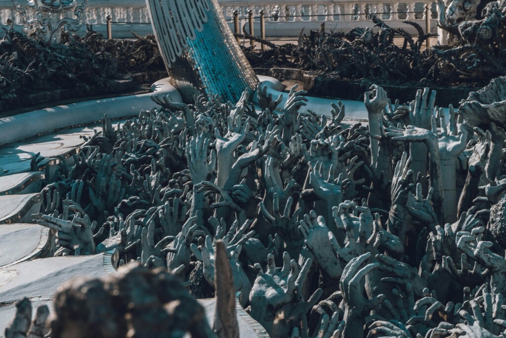 The temple is completely white to symbolize purity and the Buddhist path to enlightenment. You’ll first cross the “Bridge of the Cycle of Rebirth”, surrounded by eerie sculptures of outstretched hands and mythical creatures, a symbolic passage from desire and suffering to Nirvana.