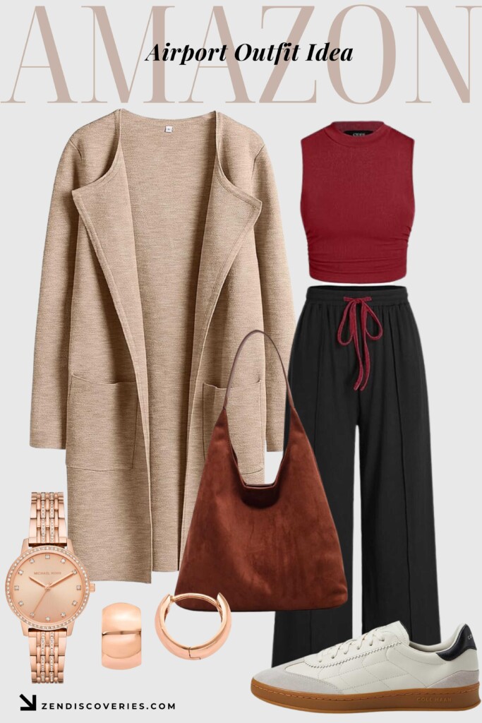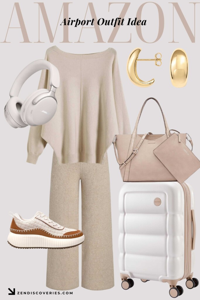 The soft knit top and matching wide-leg pants are perfect for layering, keeping you cozy and stylish on chilly flights. Paired with classic white sneakers, this outfit is ideal for navigating airport terminals with ease.
