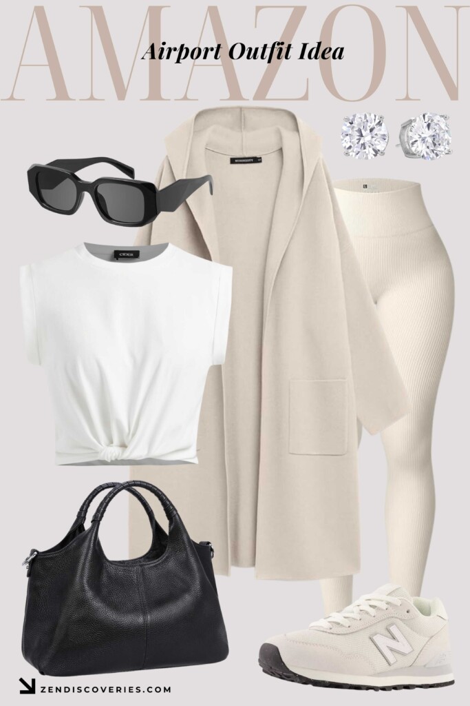 Complete the outfit with New Balance sneakers, combining functionality and style for all-day wear. The black tote bag balances the neutral tones of the outfit while offering ample space for your travel essentials. Accessories like the bold black sunglasses and sparkling stud earrings add a modern edge and a touch of sophistication.