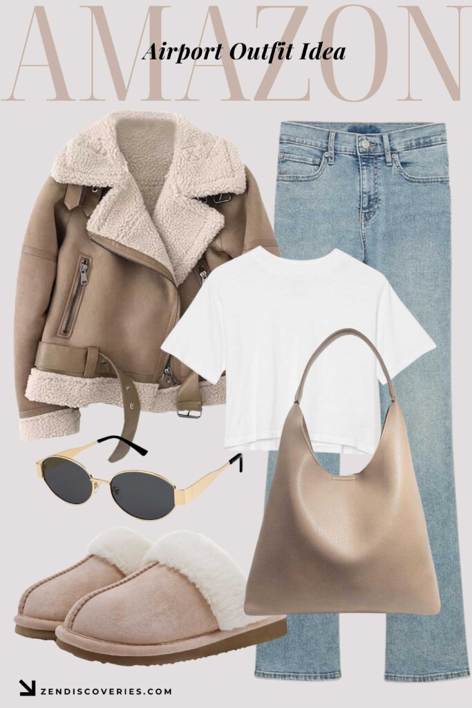 Complete the look with plush slipper shoes for cozy travels, ideal for relaxing at airports or during long commutes. Add a neutral-tone leather tote bag, perfect for carrying all your travel essentials in style. Don’t forget the chic vintage-inspired sunglasses to protect your eyes while making a bold fashion statement.